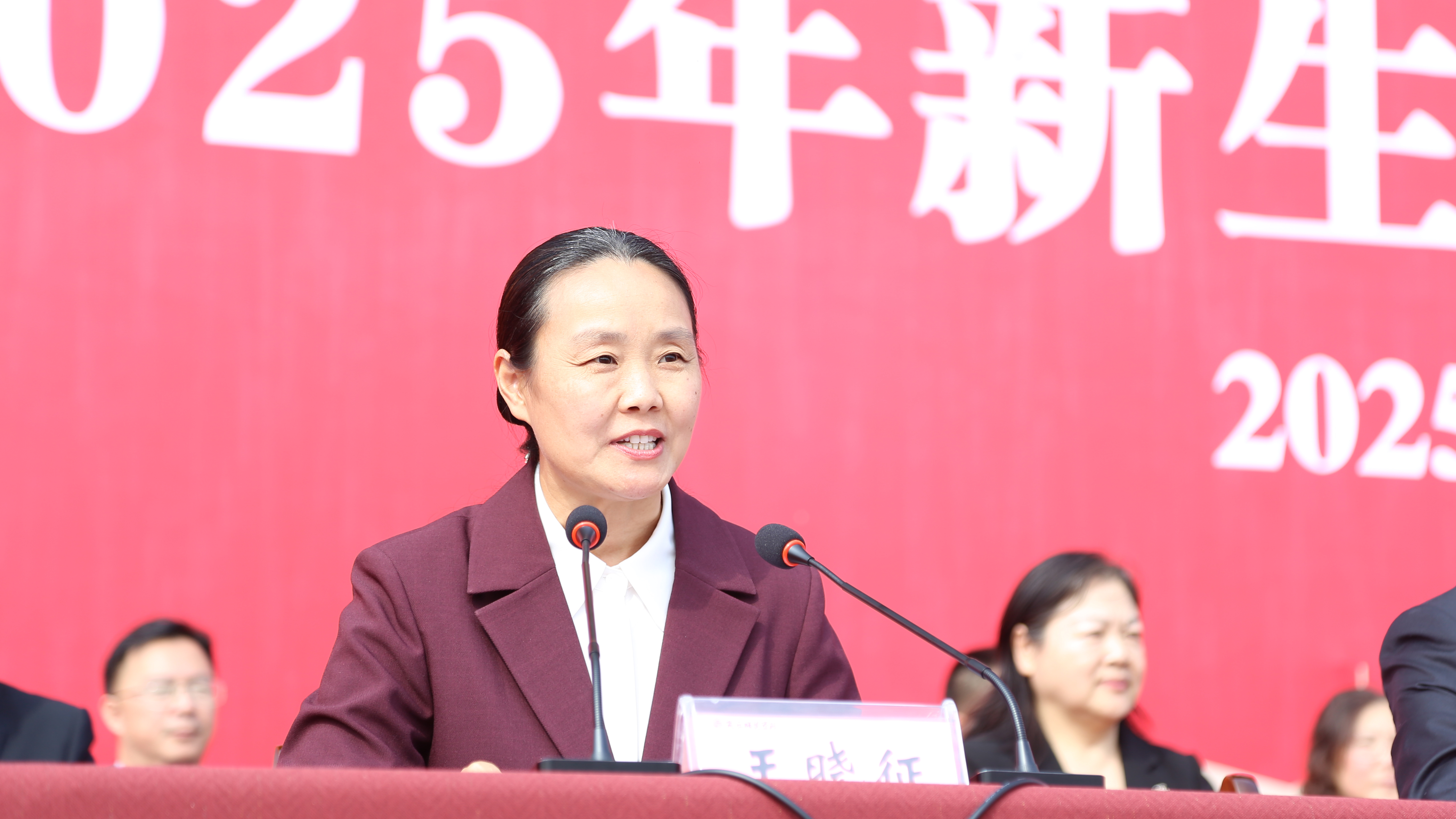 校党委书记张尚字等全体校领导为2025级新生代表佩戴校徽,并表示祝贺。