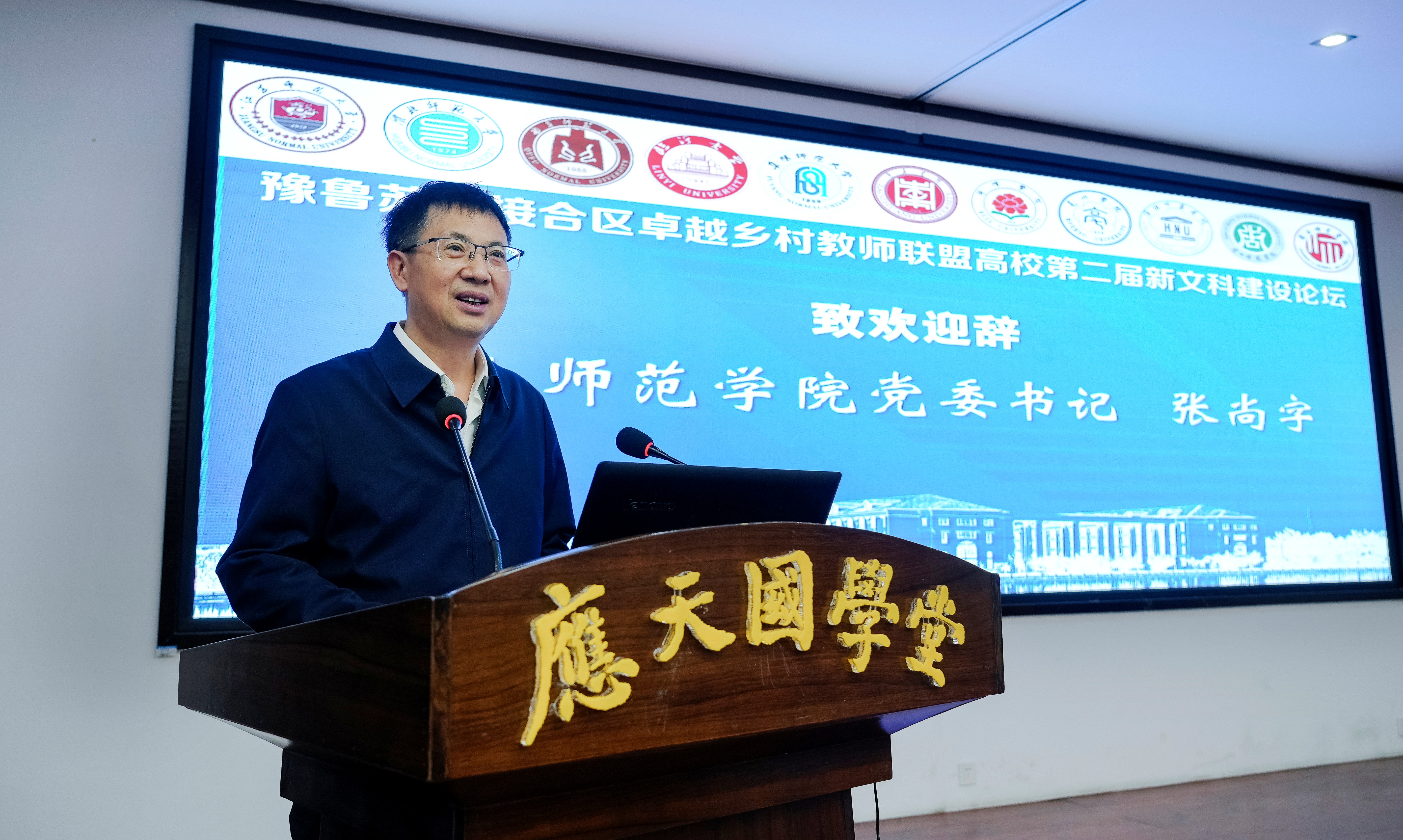 张尚字致欢迎辞,他指出,当前新一轮科技革命和产业变革正加速演进,新文科建设已超越文科自身转型升级的范畴,成为培养担当民族复兴大任时代新人、增强文化自信、服务国家重大战略需求的重要支撑。张尚字强调,新文科建设并非简单的课程增减或专业调整,而是一场涉及教育理念革新与范式重构的深层次、系统性变革。其核心在于打破传统学科间的壁垒,推动人文学科与现代科技深度融合,尤其要实现 “人文社科+人工智能” 的协同创新,进而构建面向未来、面向社会、面向实践的文科教育新生态。我校高度重视人文社会科学研究与教育教学改革工作,通过将传统文化融入课程体系、创新育人模式等举措,正积极探索新文科建设的创新路径。张尚字表示,新文科建设需要各联盟高校加强交流、分享经验,凝聚共识、携手前行,共同探索一条 “接地气、有温度、能扎根” 的新文科建设道路,为新时代高等教育高质量发展贡献智慧与力量。