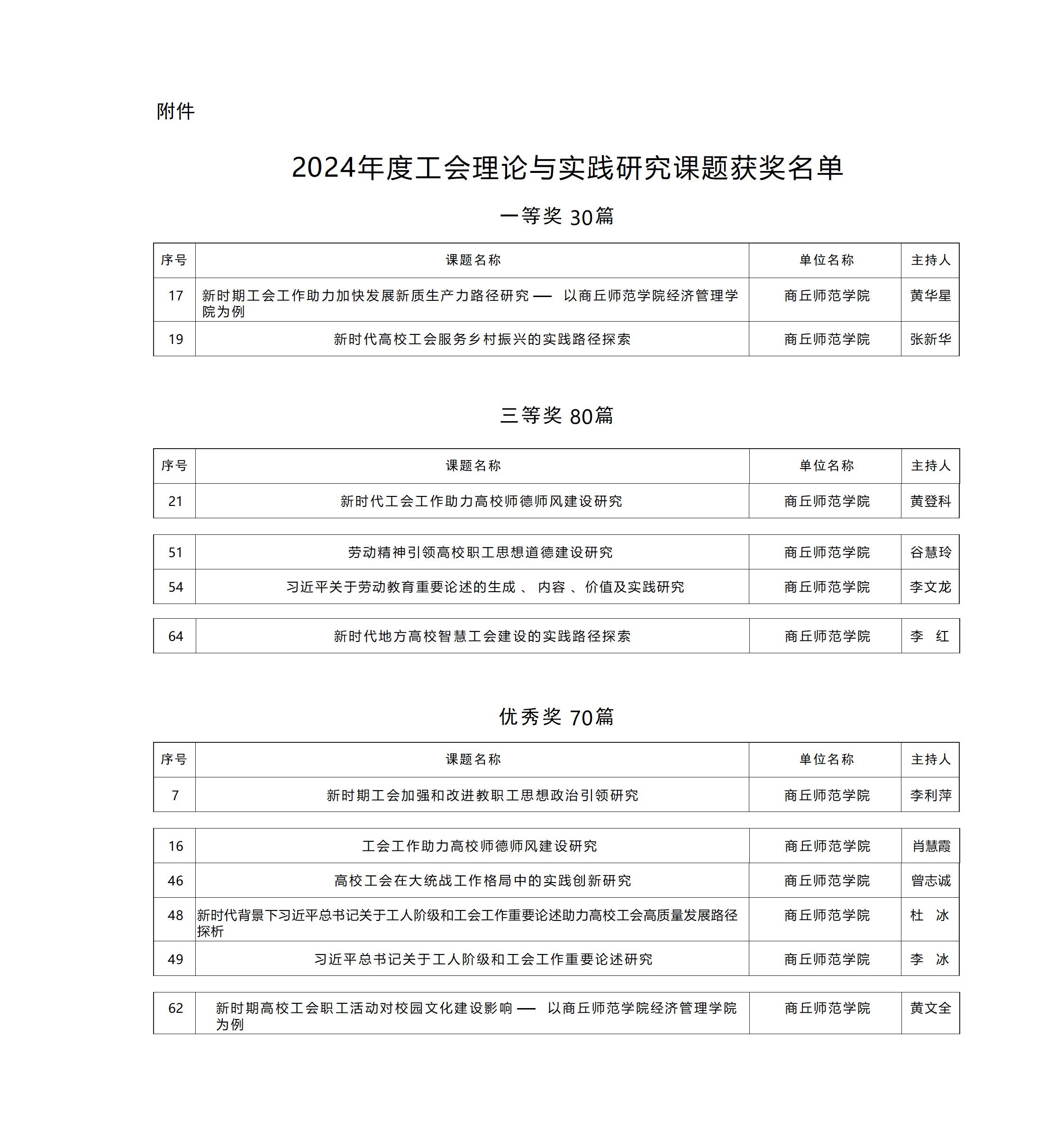 其中,经济管理学院黄华星、张新华两位老师分别主持的《新时期工会工作助力加快发展新质生产力路径研究——以商丘师范学院经济管理学院为例》、《新时代高校工会服务乡村振兴的实践路径探索》荣获一等奖。