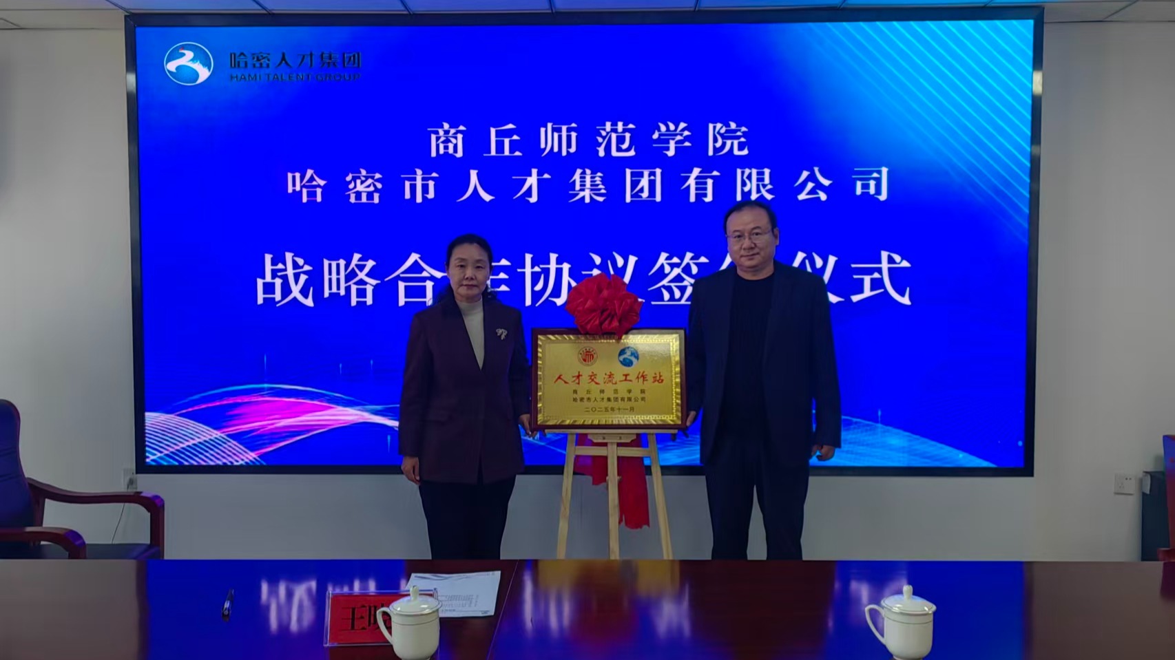 在哈密市与河南省援疆工作指挥部进行工作对接。副校长王晓征向指挥部领导介绍了学校的发展概况、学科专业特色以及服务社会、支持边疆建设的意愿。双方重点围绕依托学科优势和继续教育资源,面向哈密乃至新疆地区开展干部培训、师资进修、职业技能提升等各类培训项目合作的可能性进行了深入交流和探讨,旨在将学校的教育资源优势与新疆的发展需求紧密结合,为援疆工作贡献教育力量。为进一步建立长效合作机制,深化两地人才合作交流,商丘师范学院与哈密市人才集团签署了人才交流合作协议,并就商丘师范学院与哈密人才集团建立“人才交流工作站”举行了揭牌仪式。协议约定,双方将在人才信息共享、毕业生就业推荐、人才联合培养、实习基地建设、举办招聘活动等方面开展全方位、多层次的合作,共同搭建高效、畅通的人才交流互动平台,促进人才资源优化配置,推动各项合作意向落地生根、开花结果。