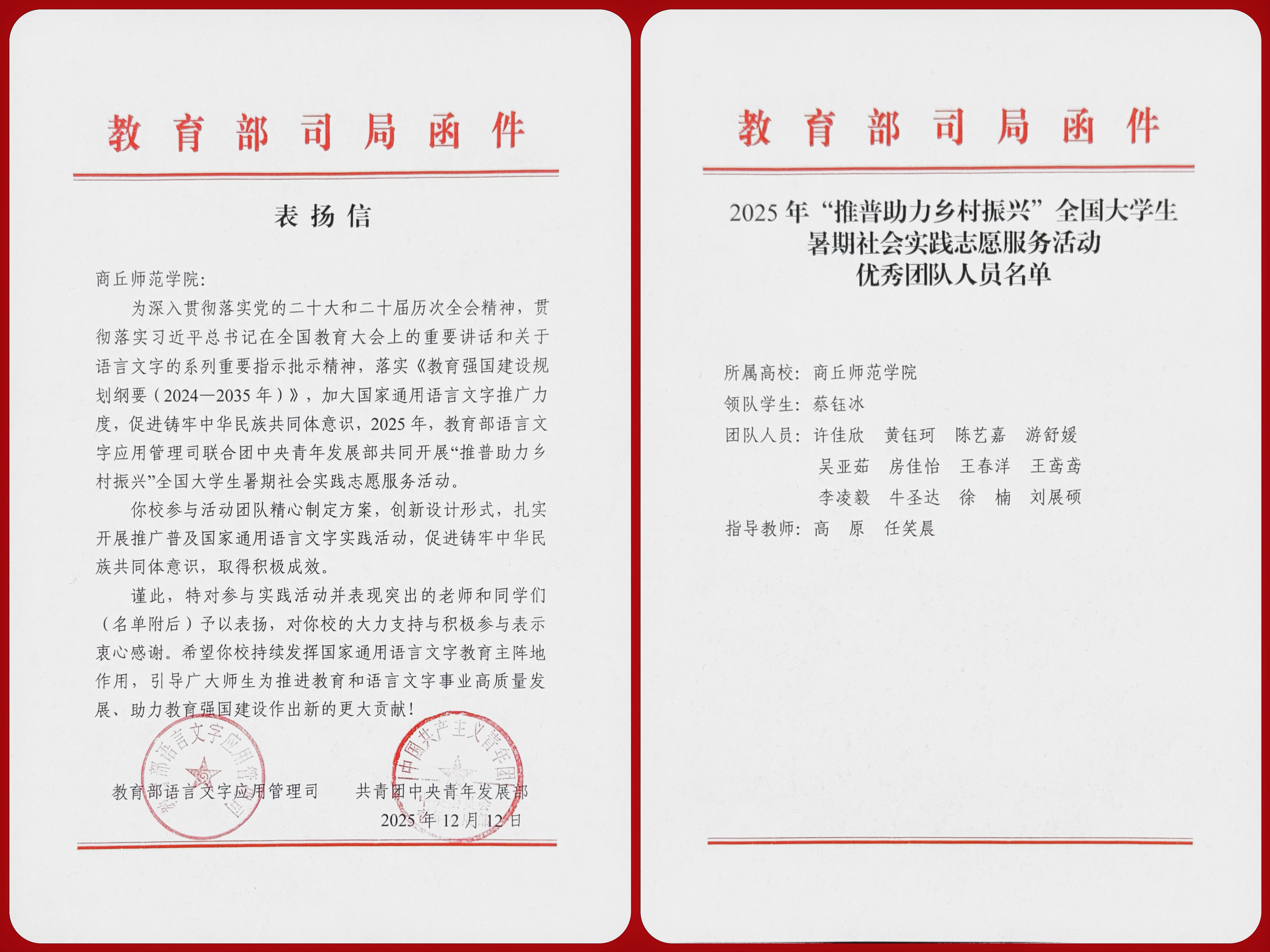 近日,教育部语言文字应用管理司、共青团中央青年发展部联合向我校发来表扬信,高度肯定我校传媒学院“归德正音·四海共语”推普服务队对促进语言文字事业高质量发展、铸牢中华民族共同体意识、助力教育强国建设作出的贡献,对参与此次实践活动并表现突出的我校师生予以表扬,并对我校的大力支持与积极参与表示衷心感谢。