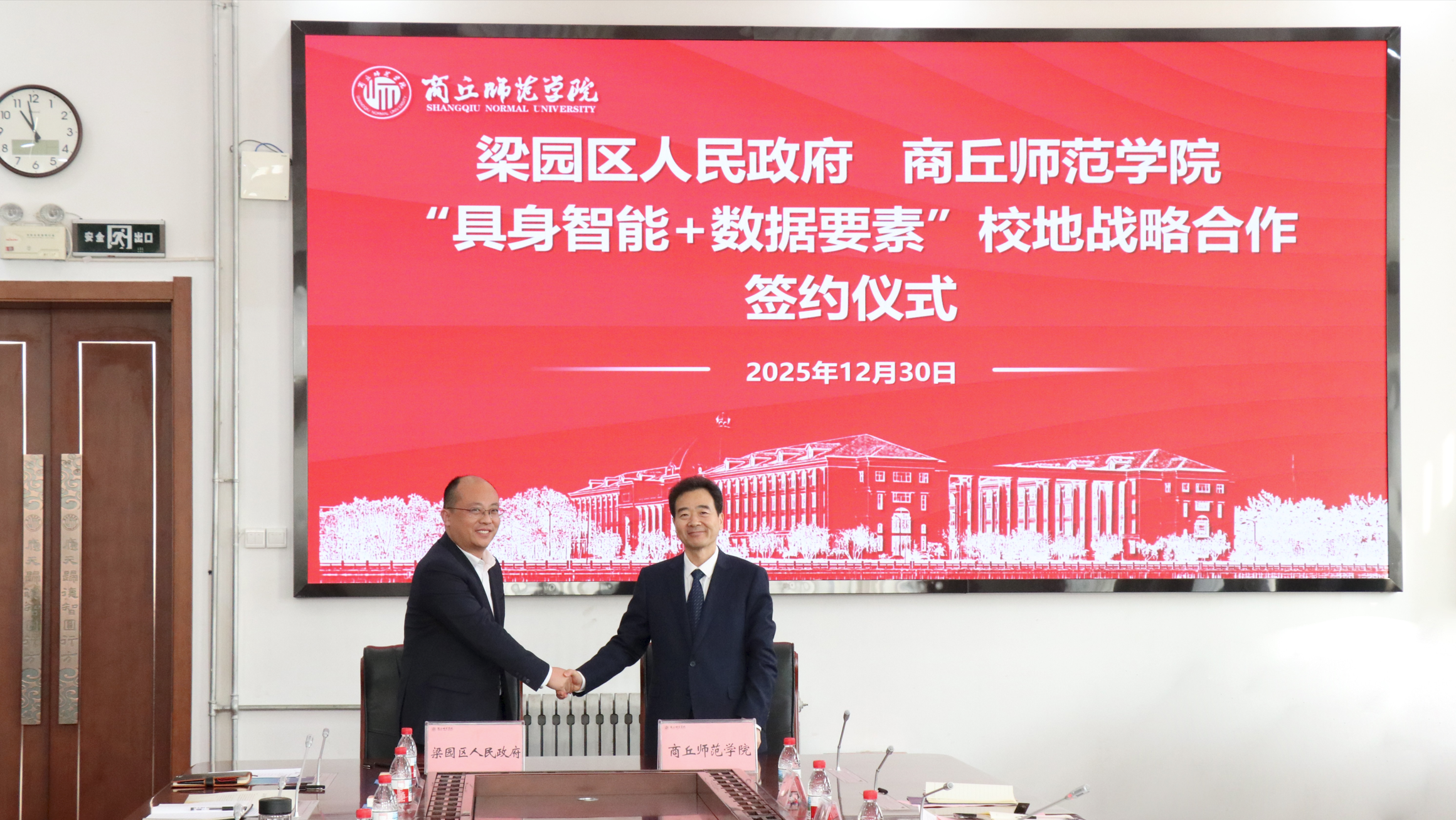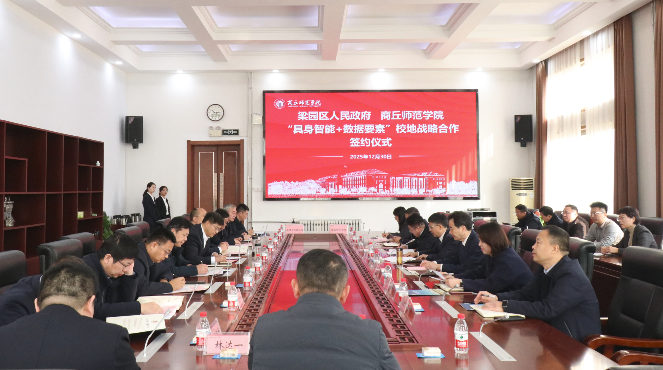 12月30日,我校与梁园区人民政府在梁园校区归德楼举行“具身智能+数据要素”校地战略合作签约仪式。校党委书记张尚字,校长陈向炜,副校长翟滨,商丘市人大常委会副主任、梁园区委书记张团结,梁园区委副书记、区政府区长魏宏志出席会议。我校有关职能部门,梁园区委、区人民政府,梁园区区直单位负责同志参加签约活动。翟滨主持会议。