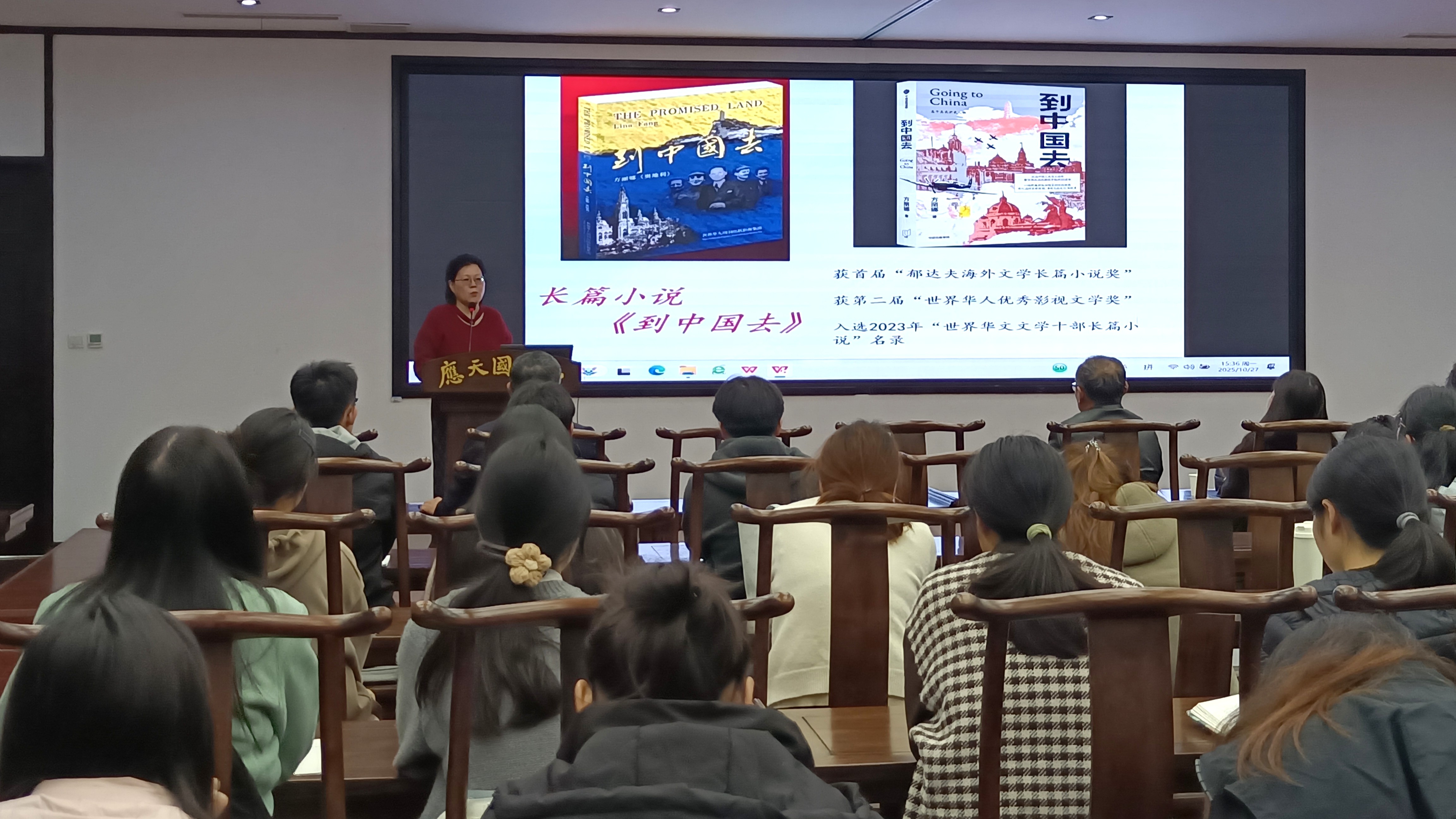 报告中,方丽娜以自身经历讲述了从商师启程赴欧深造、开启跨文化创作的历程,拆解“乡愁”内涵,探讨作品中跨国婚恋、文化碰撞等主题,强调以国际视野诠释人类命运共同体,以文字架起中西文化桥梁,践行文化交流使命,并勉励师弟师妹们坚持求知、勇于探索,将个人理想融入到党和国家事业之中。