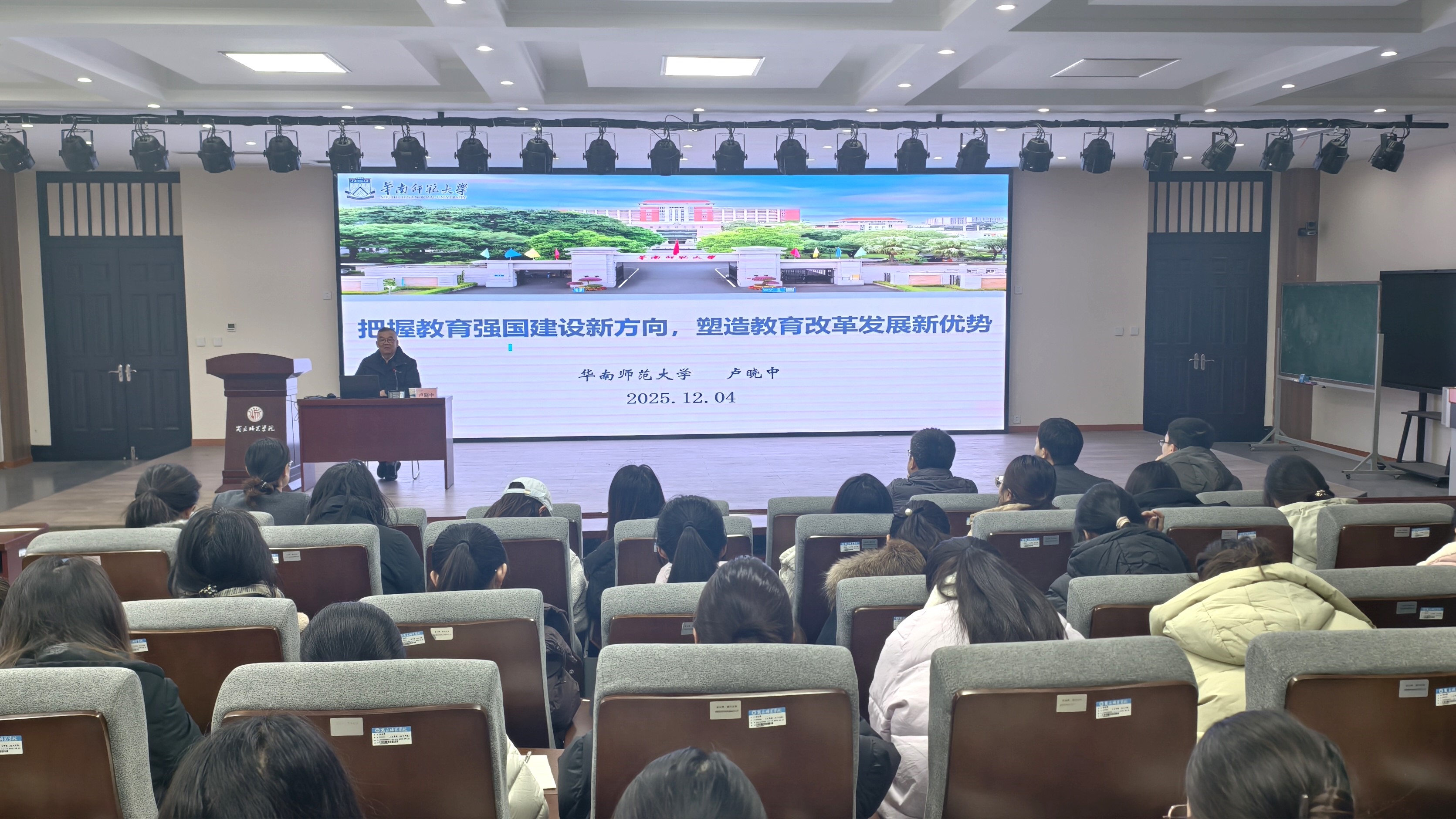 12月4日,华南师范大学教授、博士生导师卢晓中,在汉梁楼125会议室以为“把握教育强国建设新方向,塑造教育改革发展新优势”为题作学术报告。报告会由教师教育学院书记郭宁主持,教师教育学院师生代表参加。