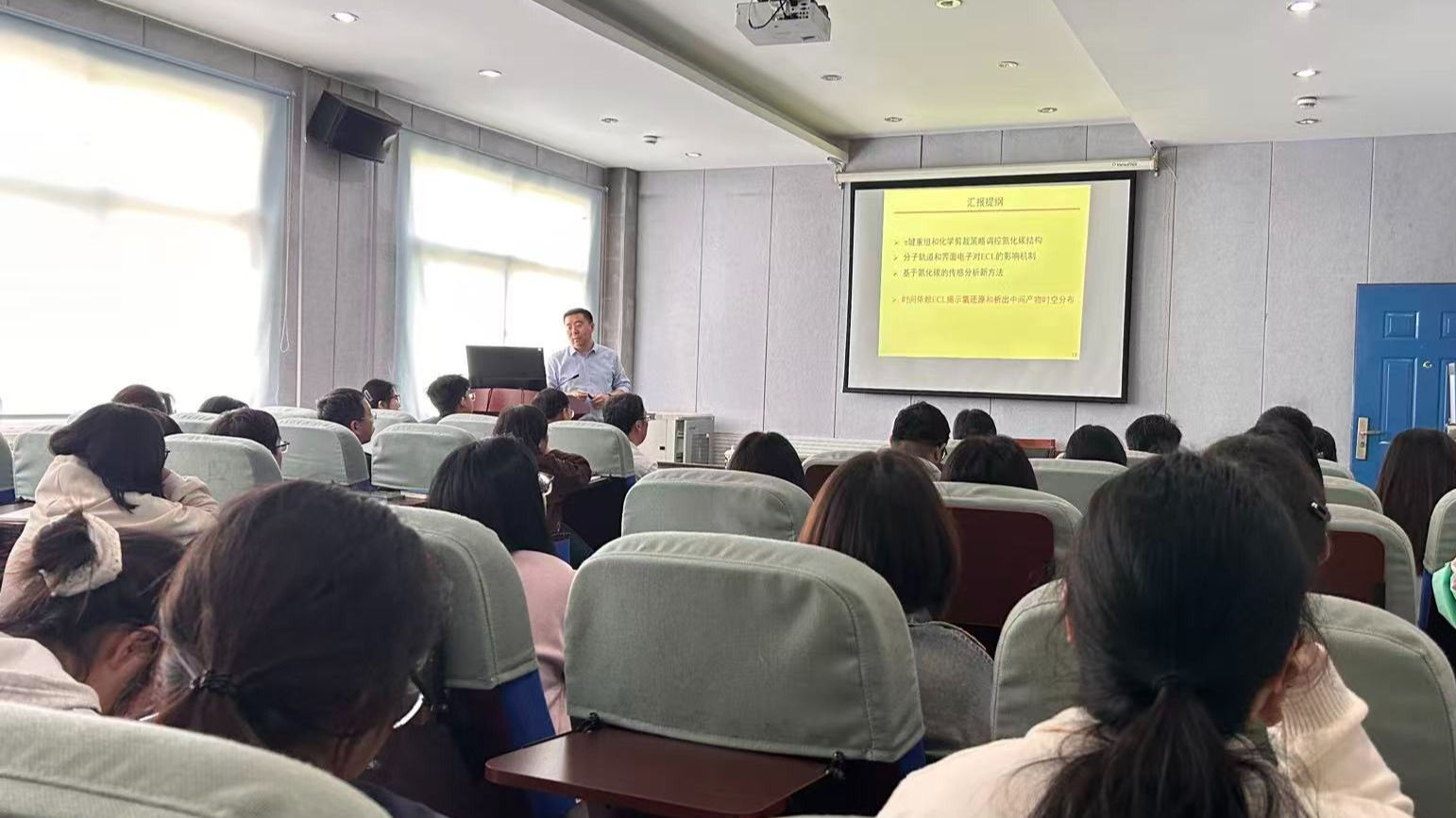 张袁健教授围绕氮化碳材料研究作深入分享,重点阐述了通过π键重组与化学剪裁策略实现氮化碳结构精准调控的方法,深入剖析了分子轨道与界面电子转移过程对电化学发光性能的影响机制。同时,系统介绍了基于氮化碳材料构建高灵敏度、高选择性传感分析体系的新路径与新方法,并结合时间分辨电化学发光技术,清晰揭示了氧还原与析氧反应中间产物的时空分布规律,多维度、全方位展现了该领域的前沿研究方向、关键技术突破及广阔应用前景。报告内容兼具专业性、创新性与实用性,让在场师生深受启发。