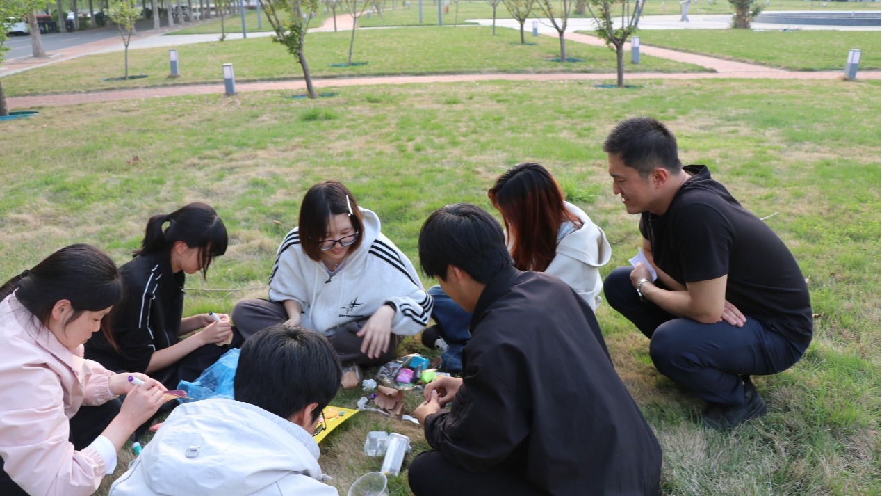 陈旭老师的《大学生劳动教育》实践课堂创新探索“劳动+心理”融合教学模式。通过“不倒森林”热身、校园清洁、废弃物运送竞速、废品拼贴画等环节,引导学生在协作劳动中释放压力、增强归属感。各小组利用废弃物创作劳动主题拼贴画,在动手劳动中激发创意,学生积极分享劳动中的感动与协作体会,实现心理疏导与劳动实践协同共进。该课程打破传统劳动教育的单一性,赋予劳动更多情感温度与心理支持功能。