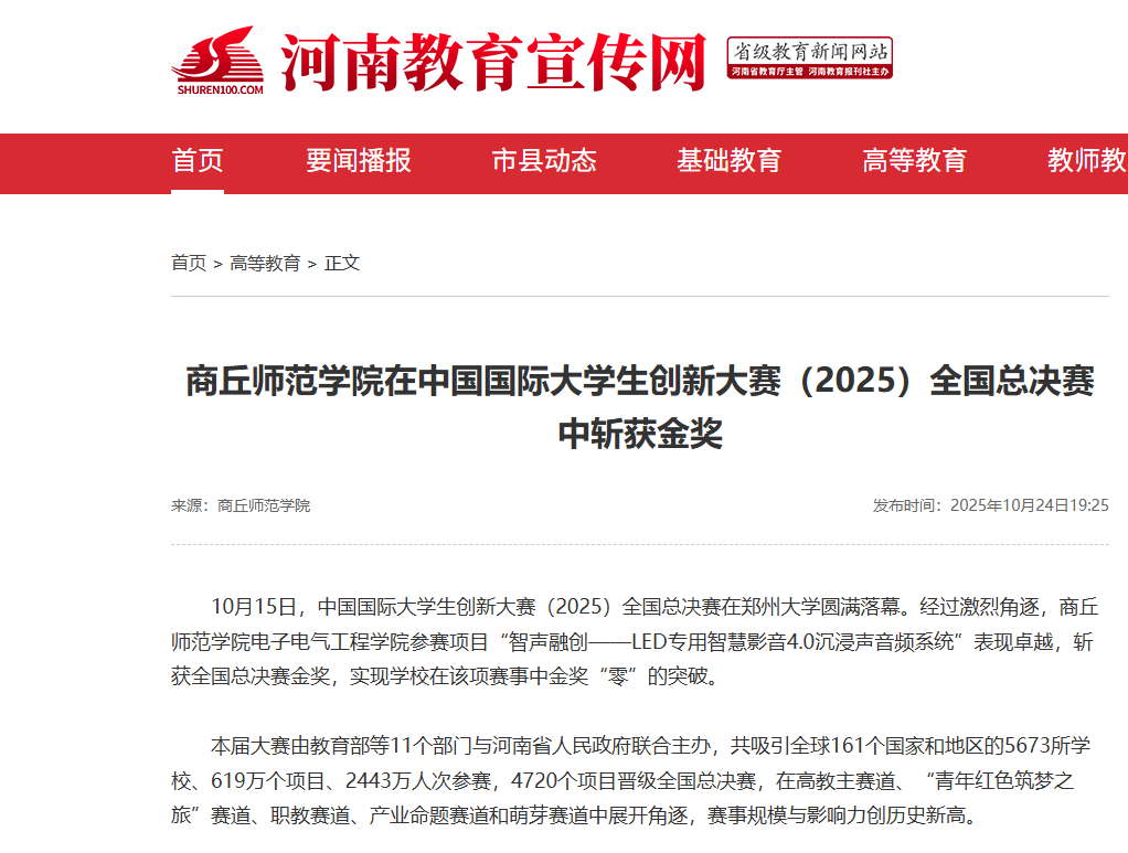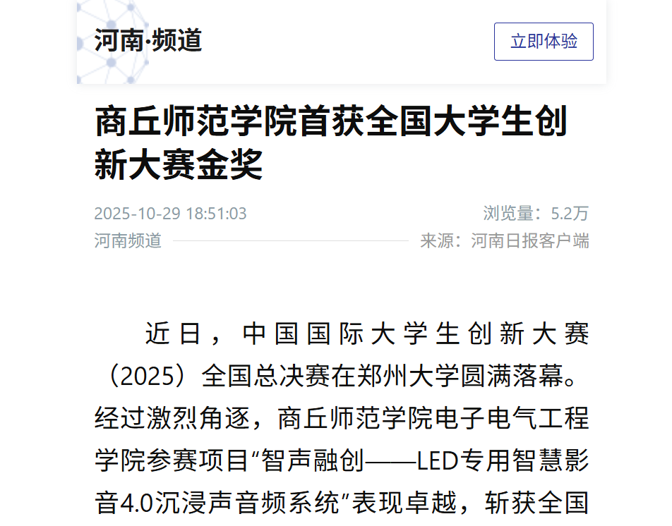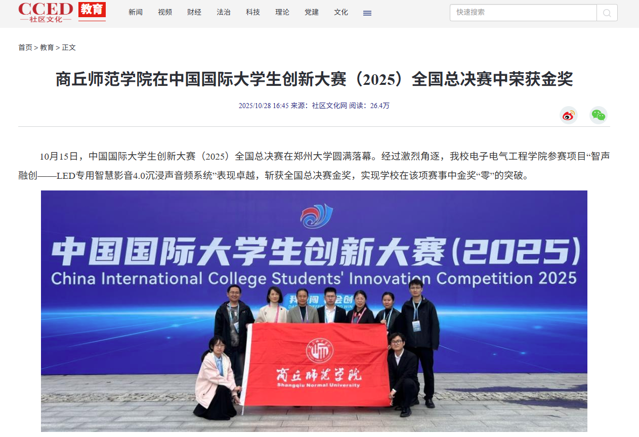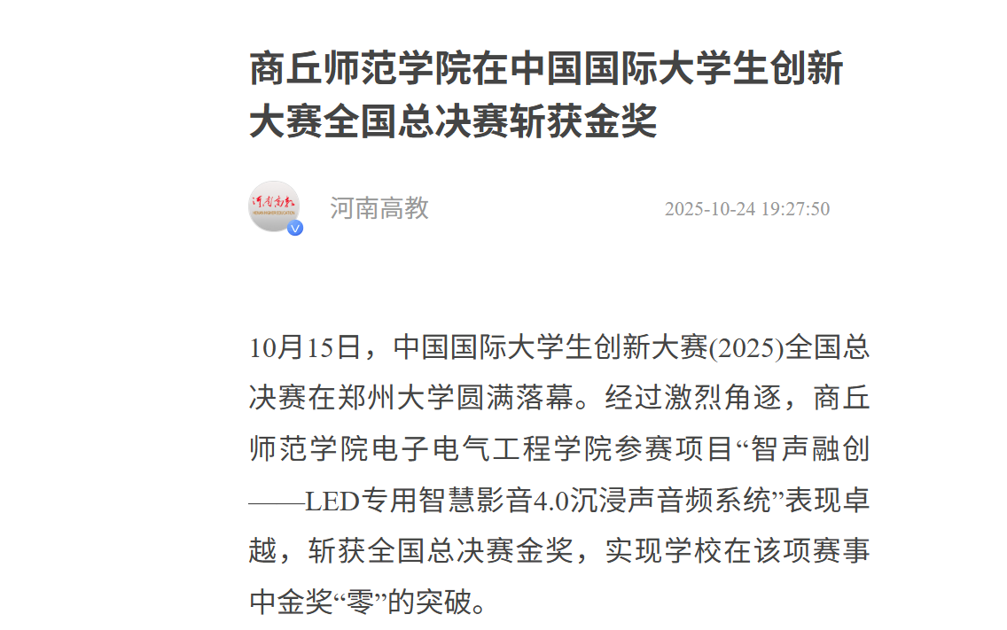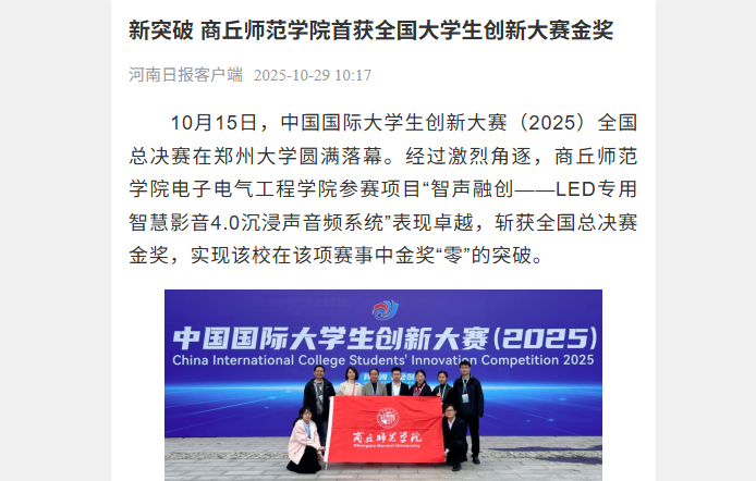 10月15日,中国国际大学生创新大赛(2025)全国总决赛在郑州大学圆满落幕。经过激烈角逐,商丘师范学院电子电气工程学院参赛项目“智声融创——LED专用智慧影音4.0沉浸声音频系统”表现卓越,斩获全国总决赛金奖,实现学校在该项赛事中金奖“零”的突破,被河南日报客户端、河南教育宣传网等多家媒体报道。