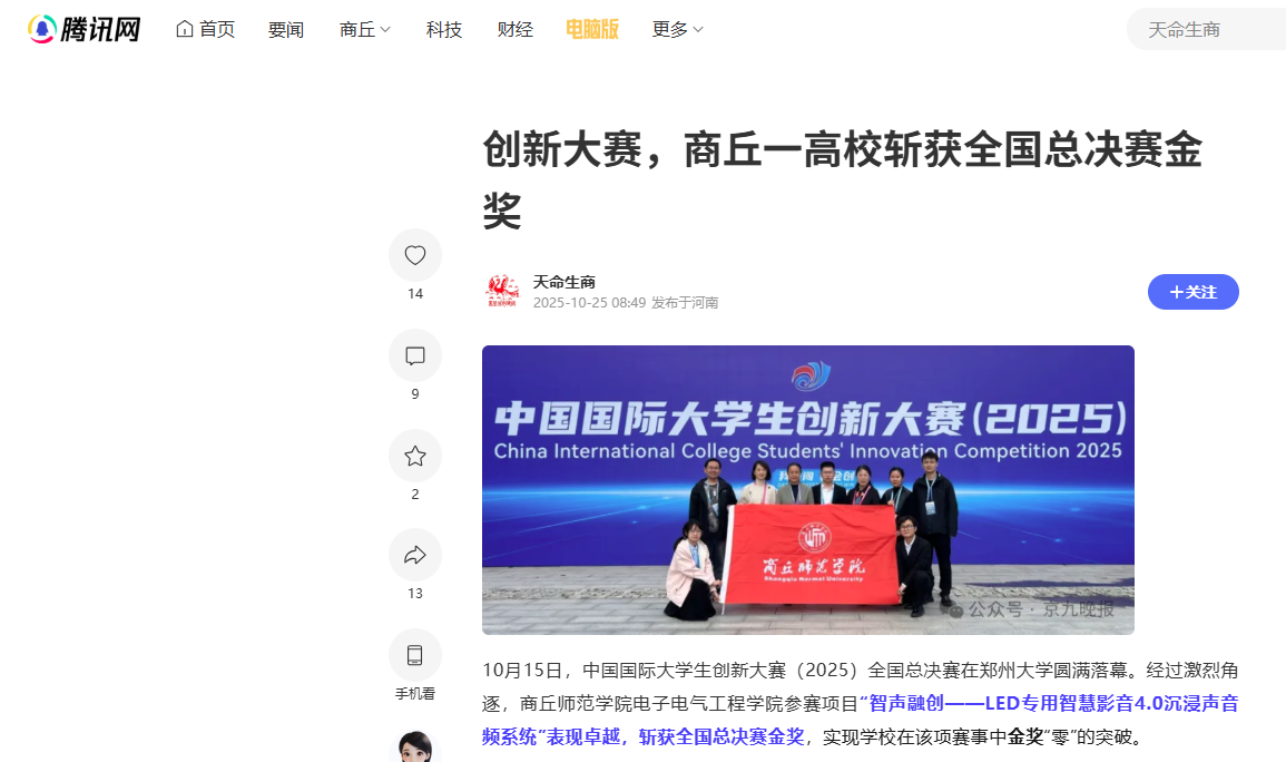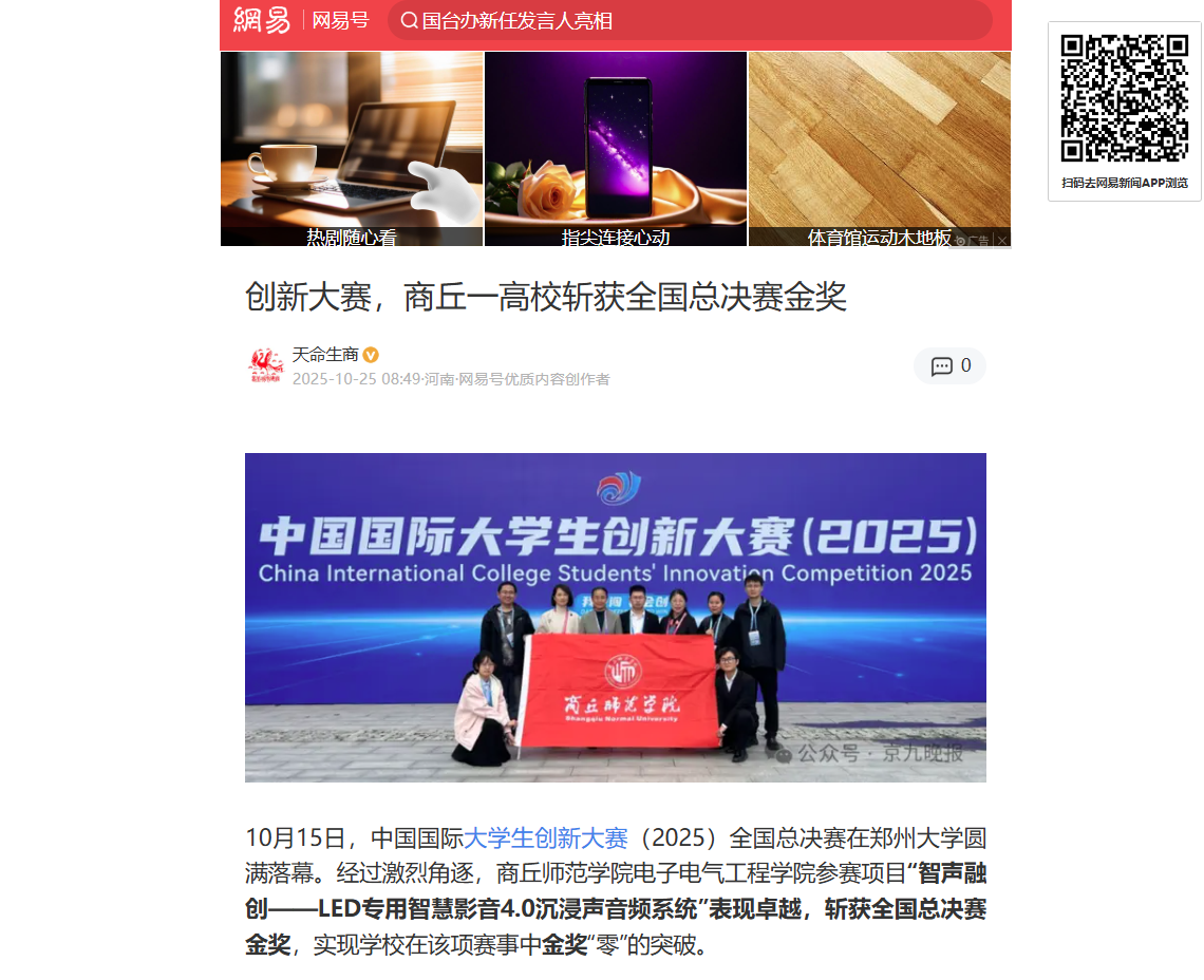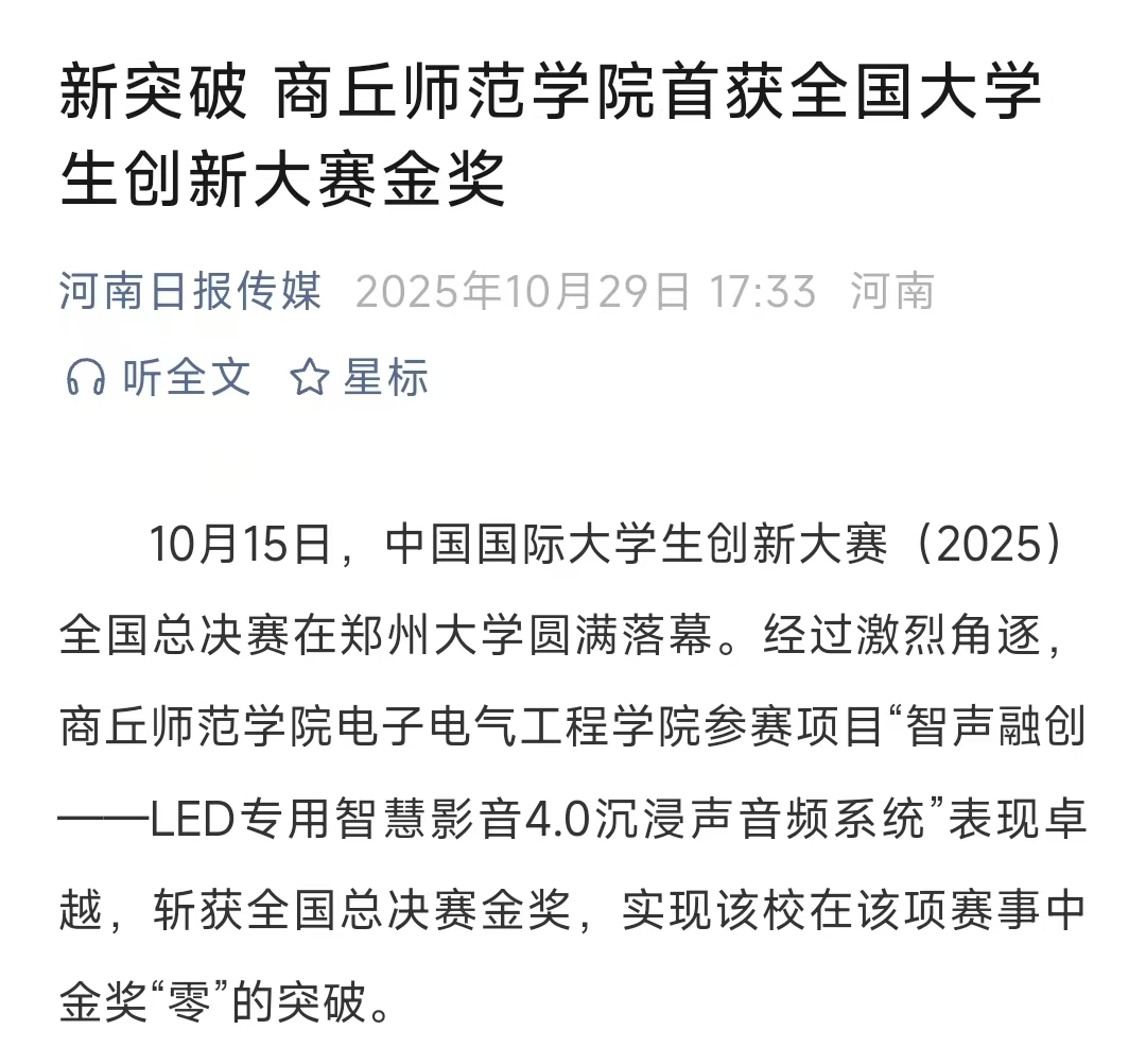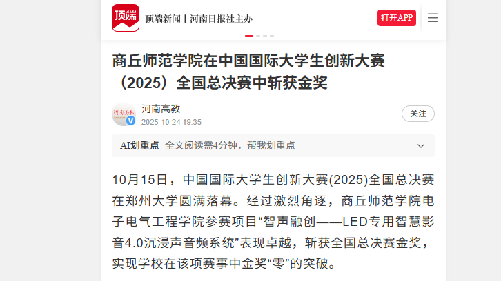 10月15日,中国国际大学生创新大赛(2025)全国总决赛在郑州大学圆满落幕。经过激烈角逐,商丘师范学院电子电气工程学院参赛项目“智声融创——LED专用智慧影音4.0沉浸声音频系统”表现卓越,斩获全国总决赛金奖,实现学校在该项赛事中金奖“零”的突破,被河南日报客户端、河南教育宣传网等多家媒体报道。
