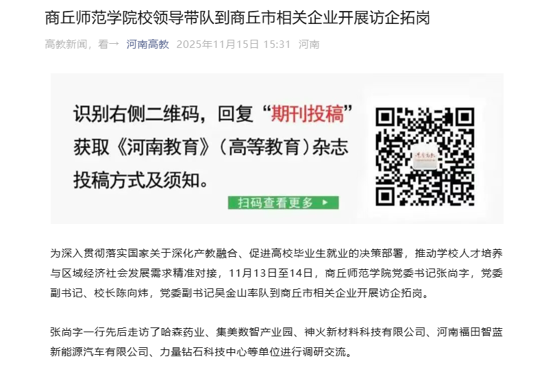 为深入贯彻落实国家关于深化产教融合、促进高校毕业生就业的决策部署,推动学校人才培养与区域经济社会发展需求精准对接,11月13日至14日,商丘师范学院党委书记张尚字,党委副书记、校长陈向炜,党委副书记吴金山率队到商丘市相关企业开展访企拓岗,被河南高教专题报道。