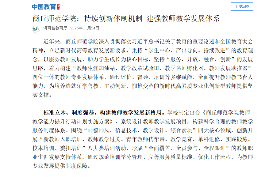 近年来,商丘师范学院深入贯彻落实习近平总书记关于教育的重要论述和全国教育大会精神,立足新时代高等教育发展新要求,秉持“学生中心、产出导向、持续改进”的教育理念,以服务教师发展、助力学生成长为核心目标,坚持“服务、开放、融合、创新”的发展思路,着力构建“教师生涯加油站、教学改革试验田、教学名师孵化器、教师发展助推器”四位一体的教师专业发展体系,通过评价、督导、培训等多维赋能,全面提升教师教书育人能力,为培养造就乐学善教、主动创新、拥抱变革的新时代高素质专业化创新型教师提供坚实支撑。