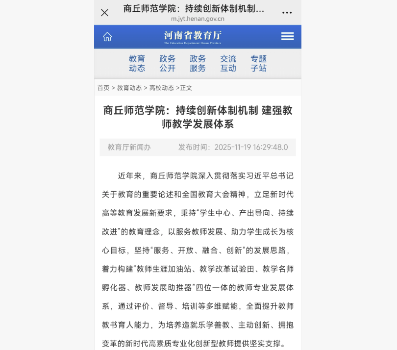 近日,河南省教育厅推介我校持续创新体制机制 建强教师教学发展体系,社会反映良好。