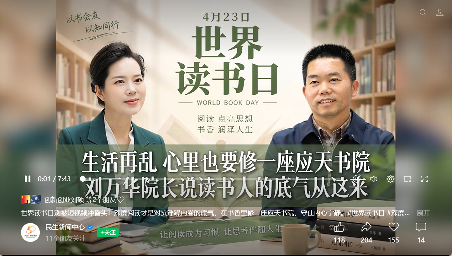 我校图书馆积极响应“共促全民阅读,共建书香社会”的号召,认真贯彻落实《全民阅读促进条例》,通过世界读书日系列活动,持续深化“党建引领+阅读推广+文化育人”融合模式。未来,图书馆将着力打造红色经典诵读、名师领读等一系列校园阅读品牌项目,以文化人、以文育人,为服务书香校园建设和全民阅读国家战略贡献更大力量。